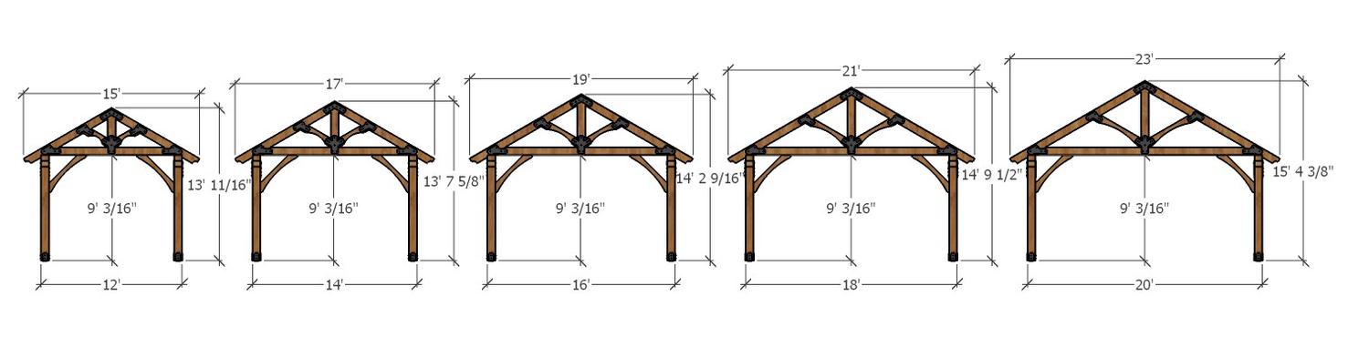 Width of structures will be determined by the width of the truss being used. For example, trusses will come in 5 different widths: 12', 14', 16', 18' & 20'. The width of a truss will be measured from outside to outside of supporting girders (not including the overhang of 18" on each side) which will give you plenty of overhang to shelter you from wind and rain. Example: A 12' wide truss with a 18" overhang on each side totals out to 3' of overhang plus the 12' wide truss will be a 15' overall length. A 20' truss will have a length of 23'.