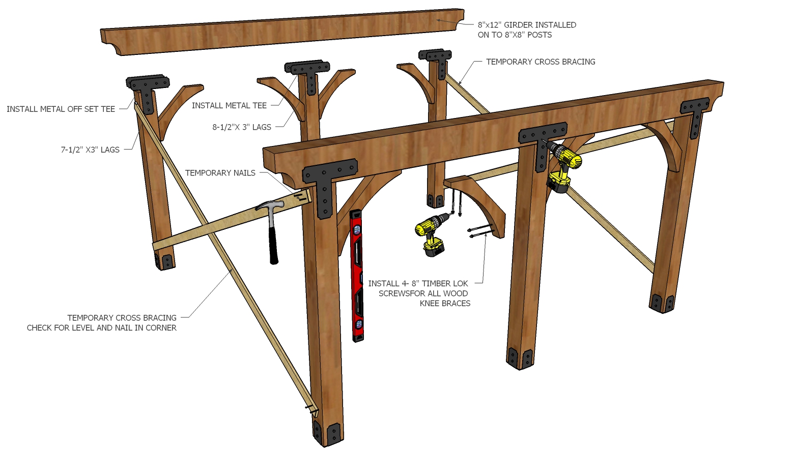 Install 8"x12" Girder on top 8"x8" post. Make sure spacing at the bottom of vertical post are the same as the top where the girder hits the post. Also make sure posts are parallel and plum with each other. Install temporary supports like 5/4"x3" Spruce to keep the posts plum during the installation of 8"x12" girders. Install the 36" long wood angle brackets on the inside corner where vertical 8"x8" posts meet the horizontal 8"x12" girder. At this point it is very important to keep checking for plum with level to make sure the angle brackets are not installed when the structure is slightly racked or off plum after the 8"x12" girder has been installed and that the proper overhang on girder over post are confirmed.