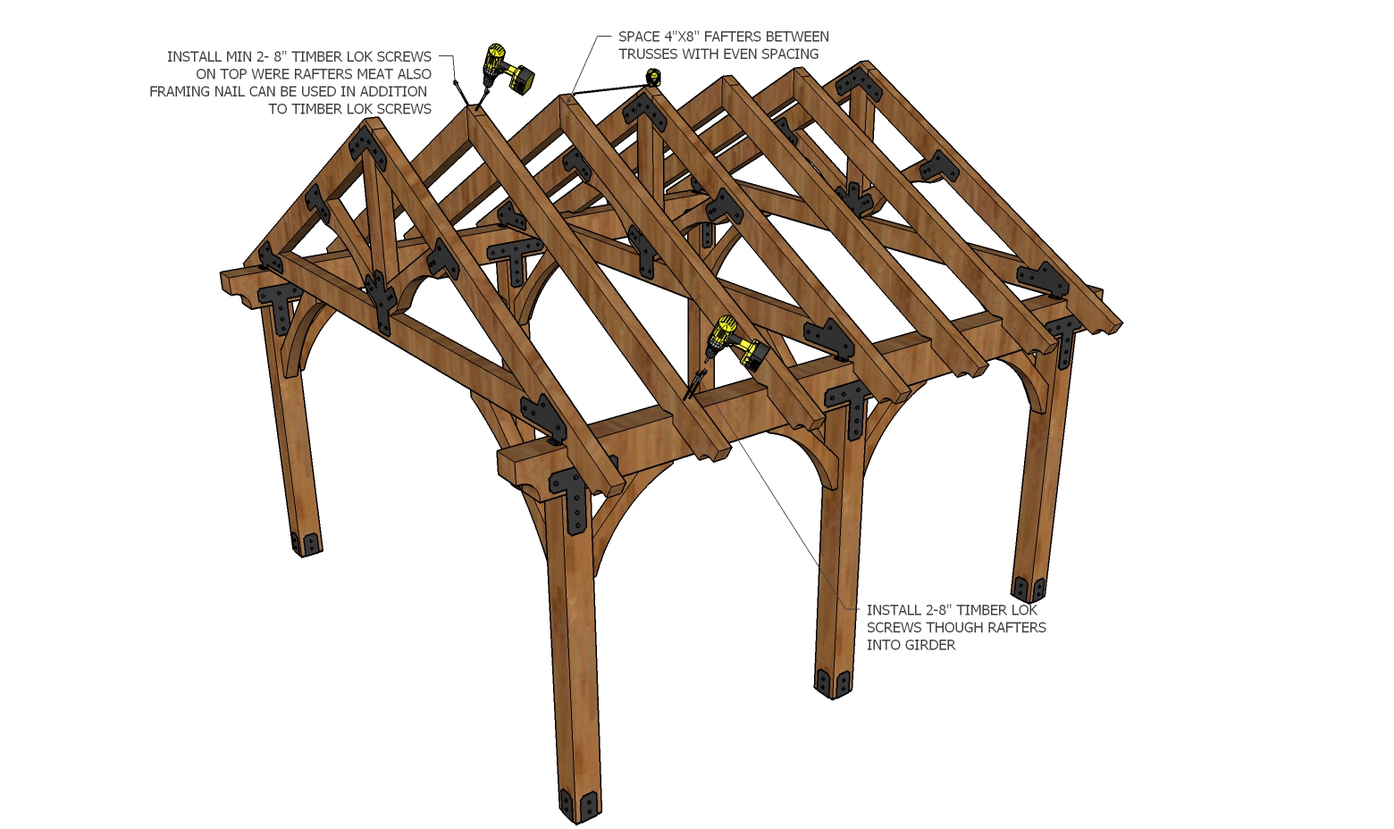 Install Trusses on top of all post locations. Make sure trusses which are 4" wide are centered over post which are 8" wide so the 52" long wood angle brackets are centered over post. Use 8-1/2"x3" lag screws per truss to secure trusses onto the top of girder. A Dewalt 1/2" drive electric impact driver will work well for this or a simple hand ratchet will work. After the installation of trusses it is time to install the 52" long wood angle brackets up under the truss to post. Use 4 - 8" long TimberLok screws, make sure you check for plum on structure before the final screw is installed. After all the wood angle brackets are installed, the temporary supports can be removed or they can remain until the end of the install.