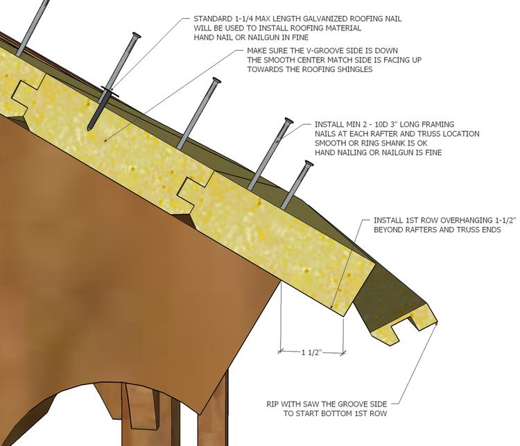 • Make sure you leave a 1-1/2" overhang beyond rafter & truss ends, the ends will be protected. Install roof decking with Minimum 10D Framing nail or 3" long screw can also be used but make sure all nails or screws are flush with the top surface of decking. Put a minimum of 2 nails per each rafter and truss starting from the bottom and working your way up. This will make the installation a lot easier.