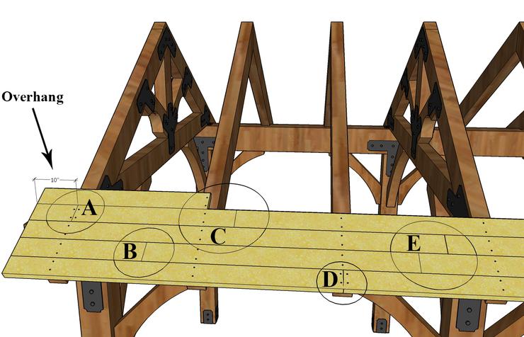 Install 4"x8" Rafters between trusses. Depending on the length of kit purchased, the number of rafters between trusses and spacing between trusses & rafters will vary. Check the spacing and make sure that it matches the plane or with a tape measure space them equally apart. Install TimberLok screws at the ridge point and birds mouth area. Additional framing nails or screws can be added at these points.